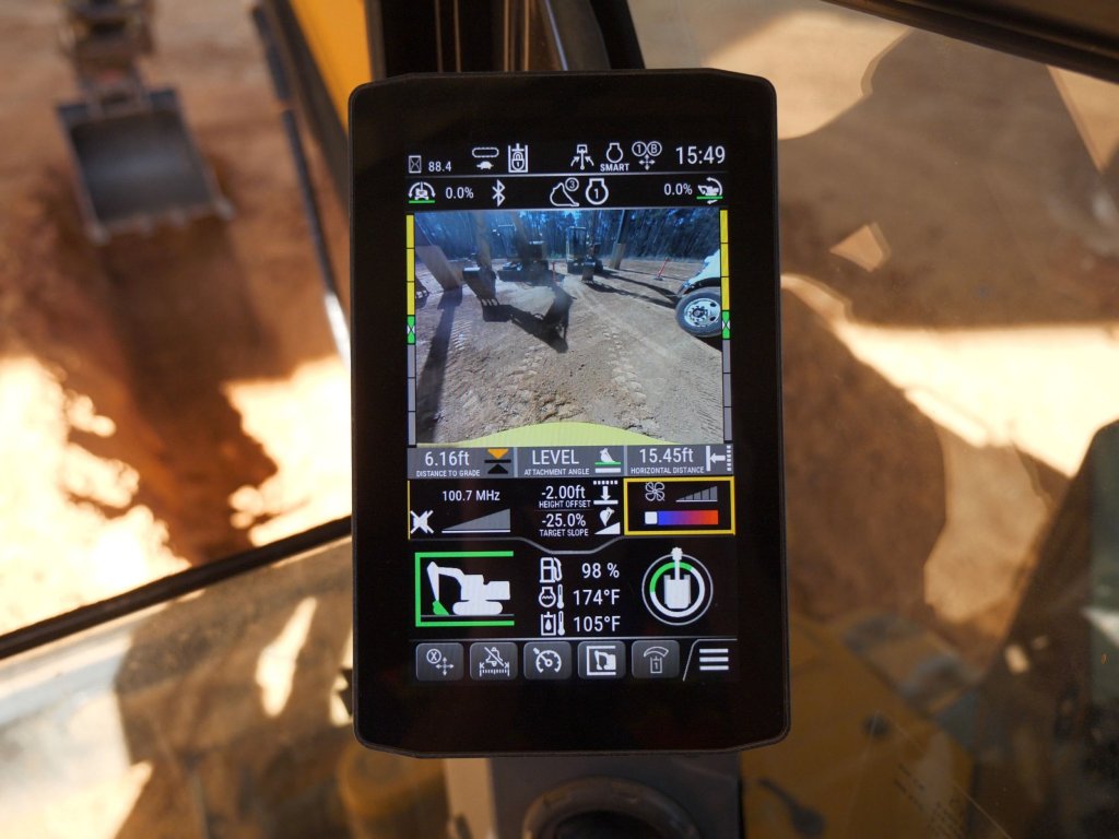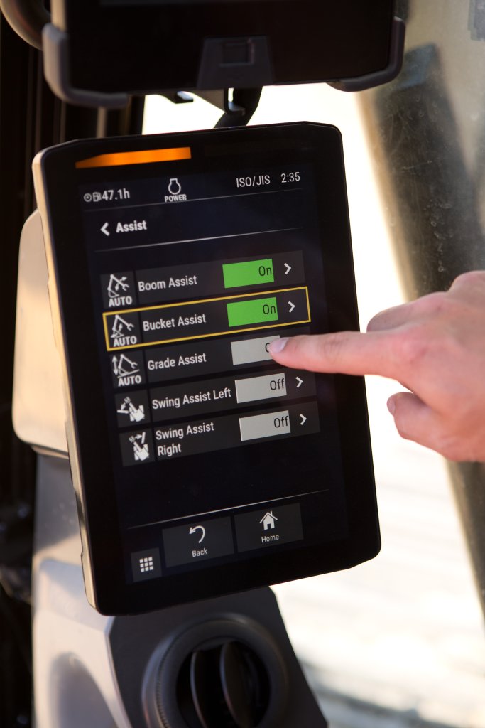 Conçue pour améliorer la productivité, la fonction Bucket Assist maintient automatiquement le dernier angle connu du godet. Elle garantit ainsi une coupe précise et régulière pour les applications de nivellement, de finition et de creusement de tranchées, le tout contrôlé directement depuis le moniteur de la machine.