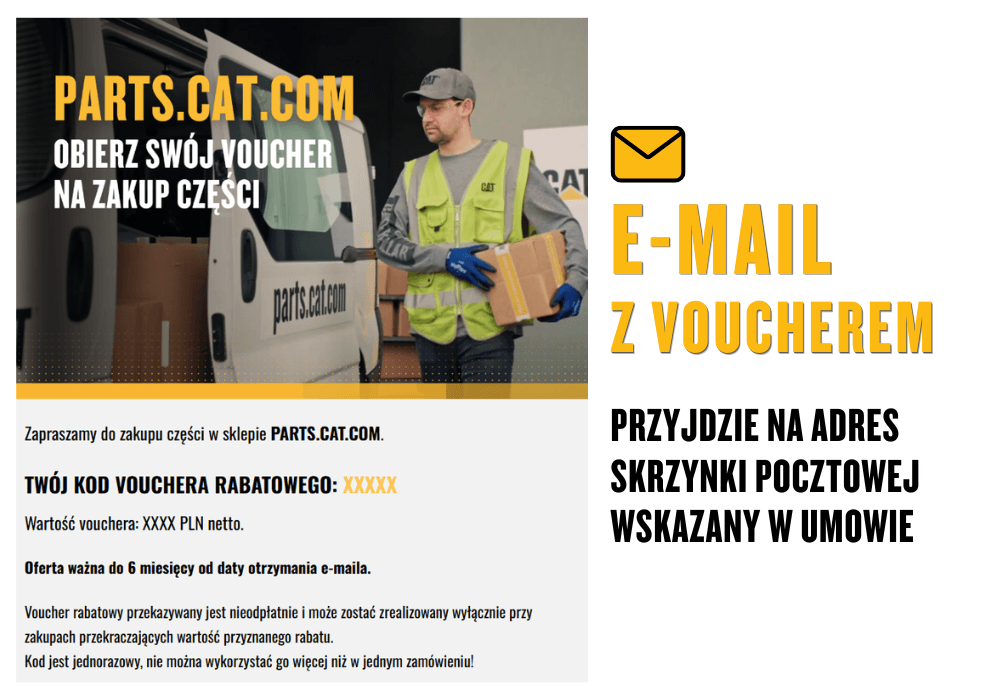 Innowacją w skali rynku jest system rekompensat. Jeśli spóźnimy się z dostawą części lub terminem przeglądu, kwota rabatowa zostanie przyznana za pomocą vouchera rabatowego na Twój profil w sklepie internetowym PARTS.CAT.COM, do realizacji niezbędne jest zarejestrowane konto.